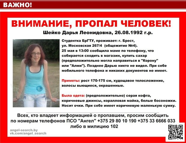 Всех, кто владеет информацией о местонахождении Дарьи, просят позвонить по телефонам +375 29 8010190, +375 33 6666033 или 102.