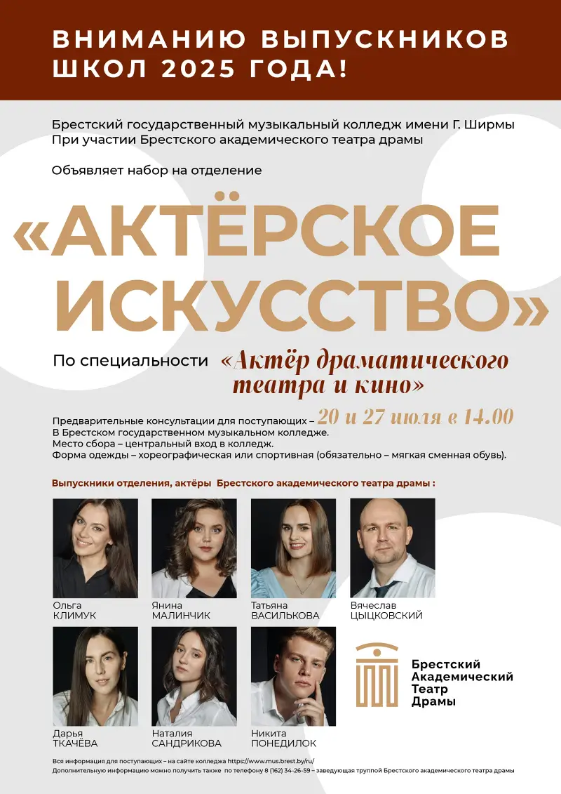 В Бресте объявляется набор на отделение «Актёрское искусство» (для выпускников школ 2025 года) по специальности «Актёр драматического театра и кино».