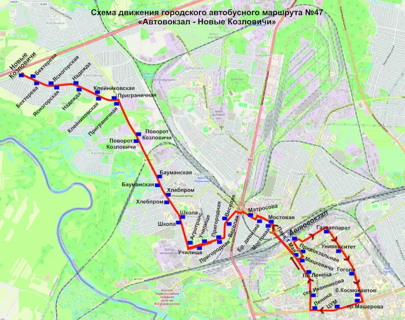 Брест. Автобусный маршрут № 47 на карте. Схема движения